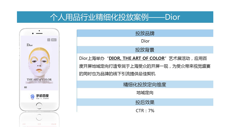 迪奧長久以來一直是百度開屏優質的品牌合作伙伴,近期其在上海舉辦“DIOR,THE ART OF COLOR”大型藝術展覽宣傳需要,因此選擇投放百度開屏精細化投放的地域定向作為投放條件對上海用戶進行大范圍的覆蓋并引導上海用戶參加線下活動。轉化率高達7%