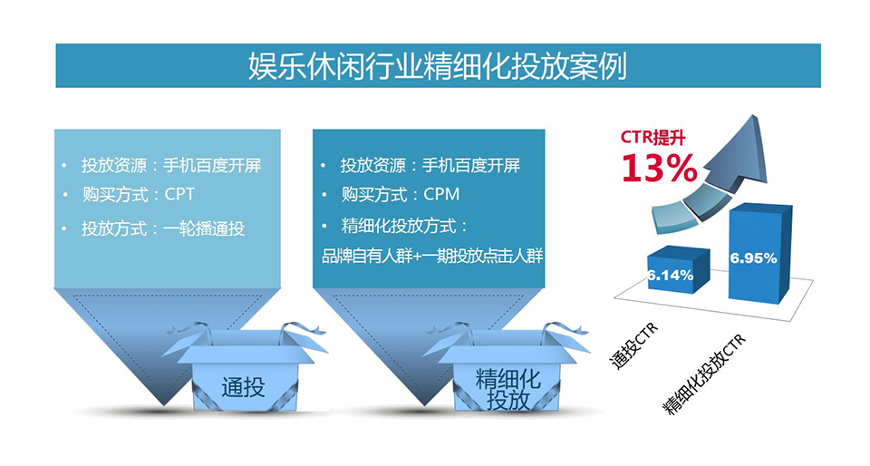 以娛樂休閑行業某top品牌為例,其定期存在電影新片宣傳需求,之前曾嘗試過CPT通投,本次選擇精細化投放方式與百度開屏合作,其選擇了定制化投放方式:對品牌一方自有人群及一期投放點擊人群分別進行投放,投后綜合點擊效果較其CPT投放效果提升13%,有效助力品牌在新片宣傳期大面積輻射用戶并有效拉動目標用戶轉化。